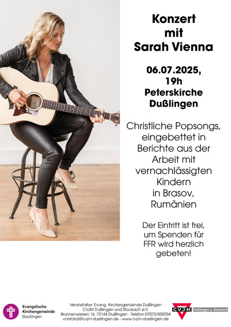 Herzliche Einladung zum Sarah Vienna Konzert am 06. Juli, 19 Uhr in der Peterskirche in Dußlingen.